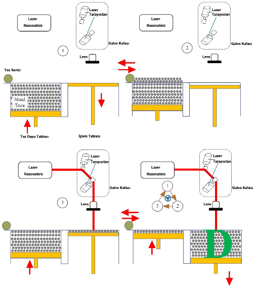 - Birinci işlemde metal tozu dolu olan toz tablasının yukarı doğru hareketi ve işlem tablasının istenilen katman kalınlığına bağlı olarak aşağıya doğru hareket ettirilmesi söz konusudur.