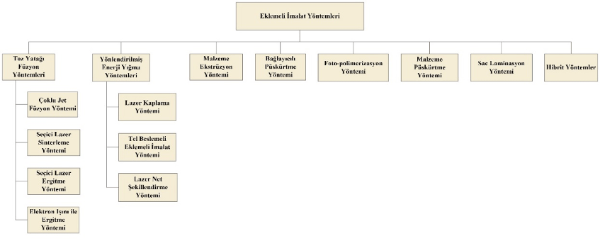 Eklemeli imalat teknolojilerinin önemi endüstride, karmaşık geometrili parçaların imalatını kolaylaştıran yapısı sayesinde gün geçtikçe artmaktadır. Eklemeli imalat, dijital ortamda hazırlanan bir tasarımın kullanılacak yönteme göre simülasyonu ve optimizasyonu ile başlar. Tasarımı onaylanan parçanın modelinin bir dilimleme yazılımı vasıtası ile imalata hazırlanmasıyla devam eden süreç, dosyanın eklemeli imalat cihazına aktarılmasıyla son aşamaya ulaşır ve imalat başlar. Katman katman üst üste eklenerek gerçekleşen imalat ile nihai parça ortaya çıkar. Eklemeli imalat yönteminin ihtiyaçlarına göre gerekiyorsa imalat sonrası işlemler uygulanır ve üç boyutlu parça son haline getirilir. Eklemeli imalat yöntemleri Şekil 2’de gösterildiği gibi sınıflandırılmaktadır.