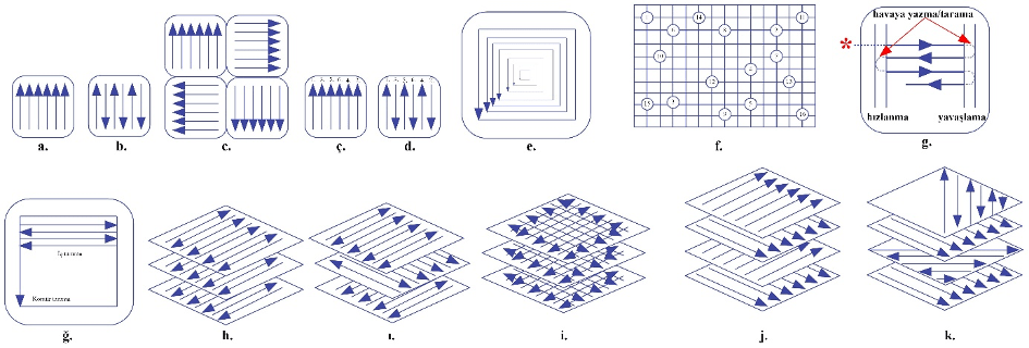 h. Çift yönlü (iki lazer geçişli veya tek lazer geçişli) katman tarama: Çift yönlü tek lazer veya çift lazer geçişli katman katman tarandığı,