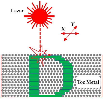 Şekil 3’te gösterildiği gibi SLM işlemi esnasında enerji, lazer ışını ile malzemeye aktarılır. Anlık yüksek enerji girişi malzemede düzensiz sıcaklık dağılımına, yüksek sıcaklık değişimine, yüksek termal strese ve büzülmeye sebep olmaktadır. Lazer gücü, lazer spot çapı, lazer tarama hızı ve lazer tarama stratejisi gibi işlem parametreleri imal edilen parçanın kalitesi üzerinde önemli bir etkiye sahiptir. Bu parametrelerin optimizasyonunun yapılması ile malzemenin yoğunluğunun, mekanik özelliklerinin ve mikro yapısının geliştirilmesi sağlanmaktadır.